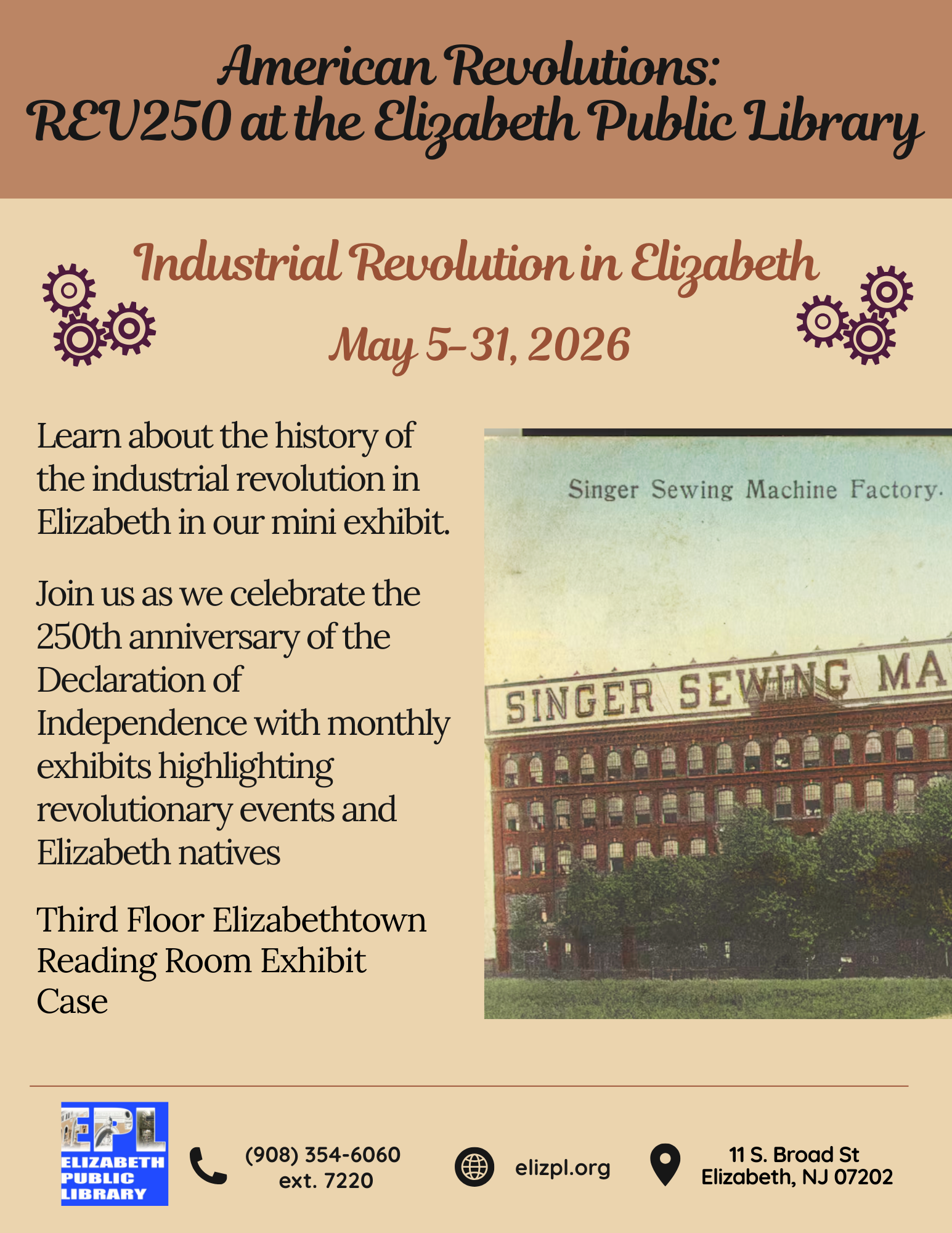 Visit the Elizabeth Public Library this May for Industrial Revolution in Elizabeth, a special mini exhibit presented as part of the library’s American Revolutions: REV250 programming.