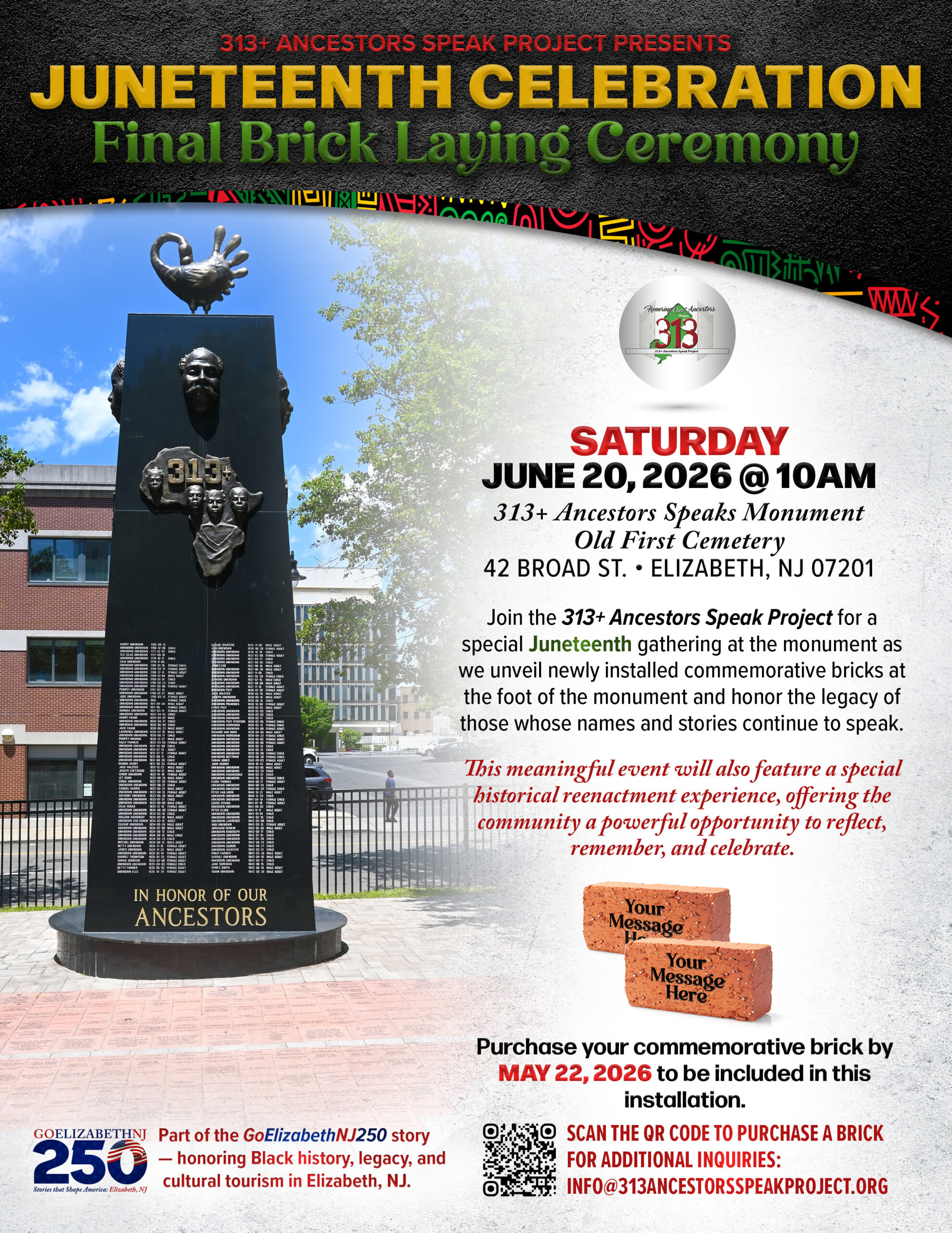 Scheduled for Saturday, June 20, 2026 at 10:00 AM, this meaningful event will take place at the 313+ Ancestors Speaks Monument at Old First Cemetery, 42 Broad Street, Elizabeth, NJ 07201. The program will include the unveiling of newly installed commemorative bricks at the foot of the monument, creating a public moment of reflection for the names and stories that continue to speak through this important site.