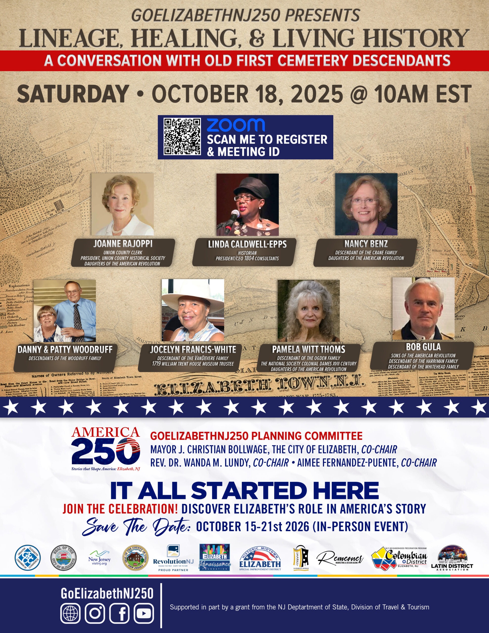 GoElizabethNJ250 presents a special online conversation with descendants of families tied to Elizabethβs Old First Cemetery. This unique event brings together historians, community leaders, and family members to share stories of lineage, healing, and living history.