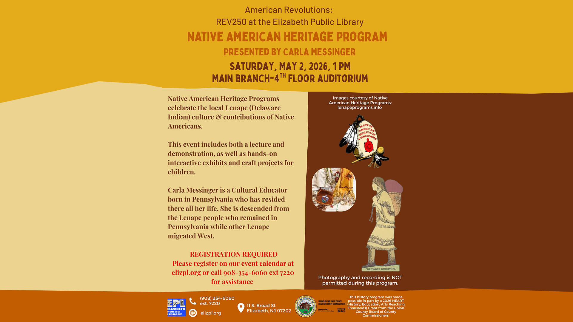 Register for the Native American Heritage Program with Carla Messinger at Elizabeth Public Library on May 2, 2026. Learn about Lenape culture through exhibits & activities.