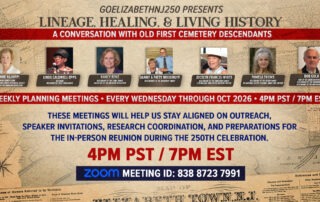 A weekly internal planning session focused on coordinating research, logistics, outreach, and programming for the Old First Descendants Reunion during Elizabeth’s 250th Anniversary.